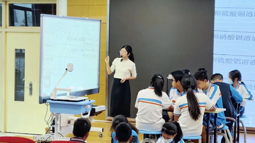 番禺区南雅学校陈颖瑜老师在课例二《金属的化学性质》(第二课时)中以制作金属铭牌为真实情景,提炼出主线问题“金属能和什么物质反应”,引导学生开展一系列的探究活动,体验科学家探索金属活动性顺序的过程。通过让学生自主选择药品制作铭牌,丰富了教学评价方式,提高了学生运用化学解决实际问题的能力。在突破金属活动性顺序的记忆和运用这一重点难点时,陈老师巧妙地使用了化学扑克牌,用游戏让学生在潜移默化中掌握知识,避免机械记忆带来学习倦怠。并预留充足时间让学生利用扑克牌展示物质是否能配对反应,充分体现了游戏激发学习动力、学生是课堂主体的理念。