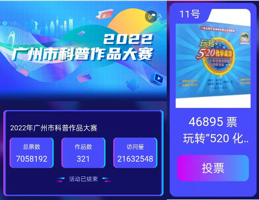 图1-2 广州市科普作品大赛颁奖仪式现场 去年6月,2022年广州市科普作品大赛网络投票环节顺利进行,大赛网络投票总访问量超过2000万人次,投票总数超700万票,经公众网络投票评选,钱扬义教授工作室历经18年研发的《玩转“520化学桌游”:化学用语启蒙教育游戏学习法》网络投票共获得46895票,排名第11名。