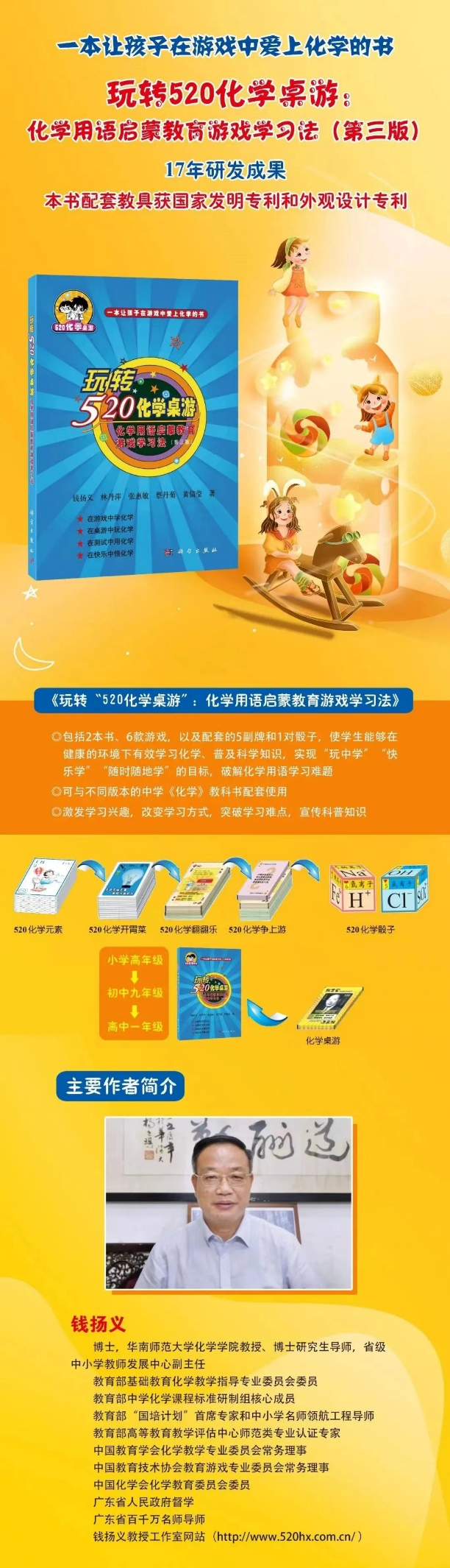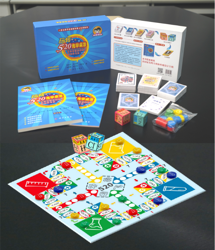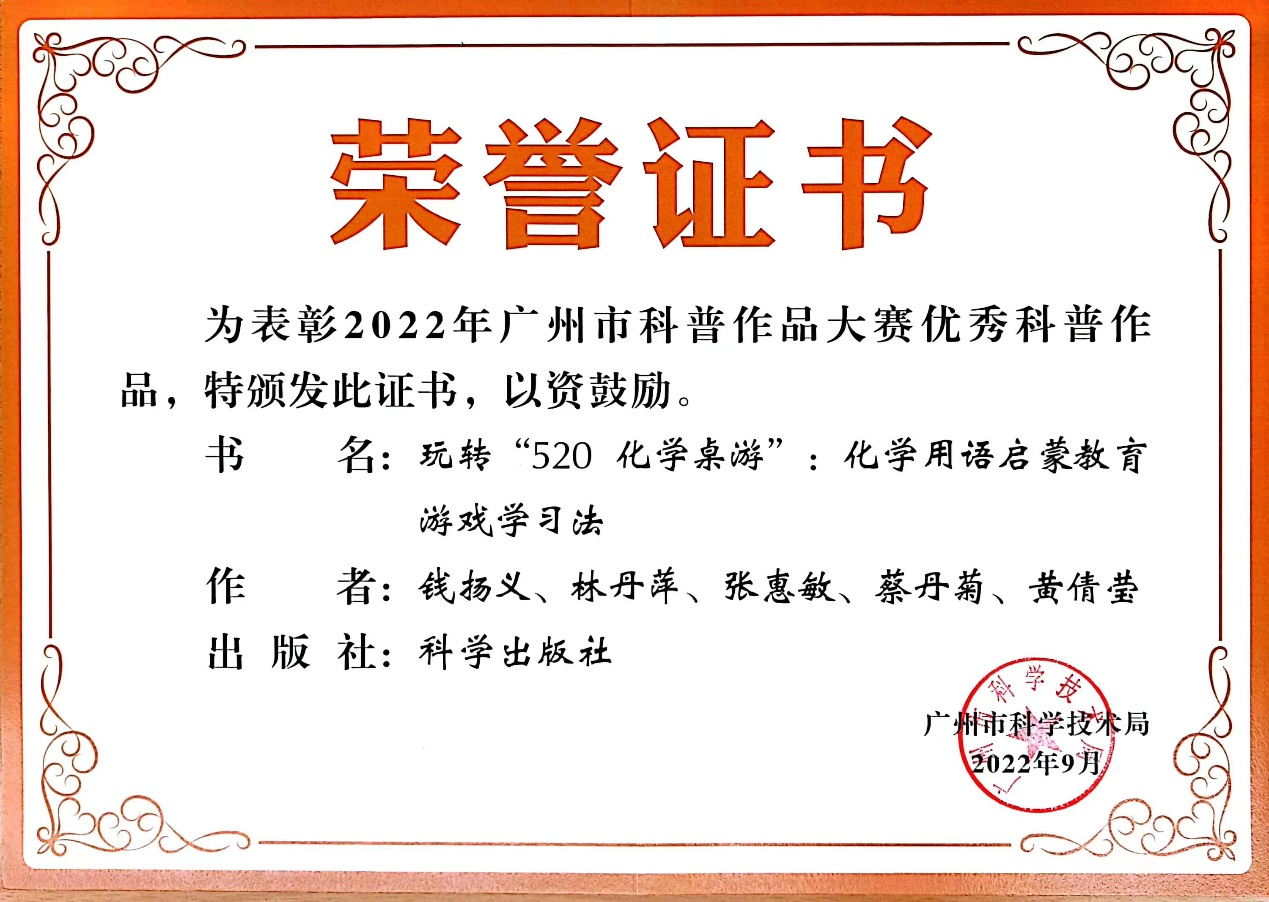 图4 广州市优秀科普作品荣誉证书 《玩转“520化学桌游”:化学用语启蒙教育游戏学习法》 NO.1 图书基本信息 长期以来,化学科普主要通过纪录片、动画等理论形式进行,存在着“只学不做”等弊端,缺乏相对轻松愉快的实践性、互动性、游戏化的学习方式。对此,钱扬义教授团队历经18年的实践探索研制出了“520化学桌游”,面向各年龄段的学生,提供兼具教育性、游戏性、技术性和艺术性的化学教育桌面游戏,致力于将游戏化教学与化学科普、化学符号学习相结合,从而推动化学科普、激发学习动机、解决学科难点、践行素质教育。 经过数次更新迭代,“520化学桌游”已具备内涵丰富的书籍与配套教具,包括大小册子两本书(教师版和学生版)、自主开发的6款游戏,以及配套的5副扑克牌、1对骰子和1副飞行棋,使学生能够在健康的环境下有效学习化学、普及科学知识,实现“玩中学”“快乐学”“随时随地学”的目标,破解化学用语学习难题。