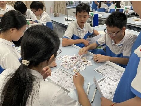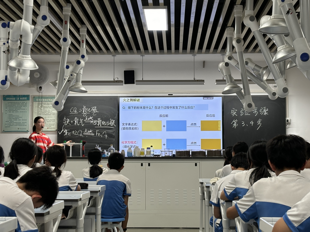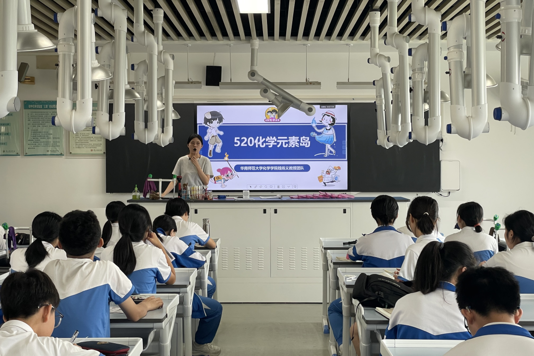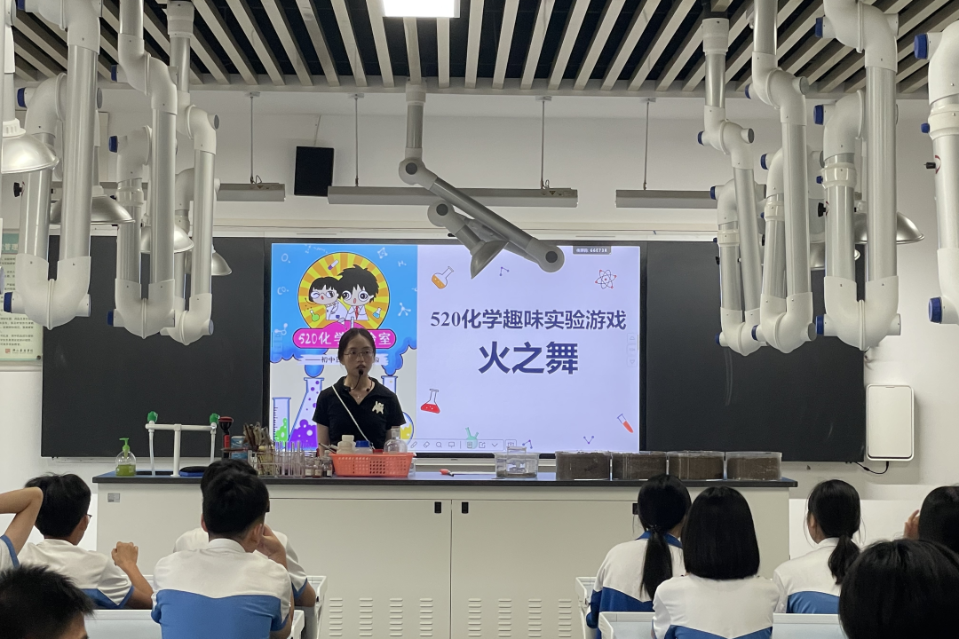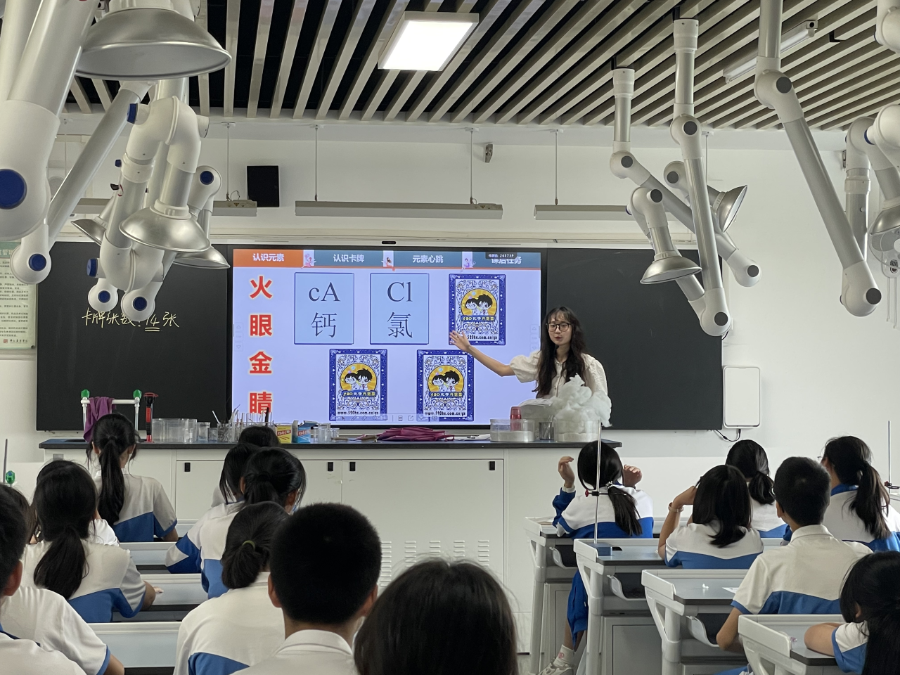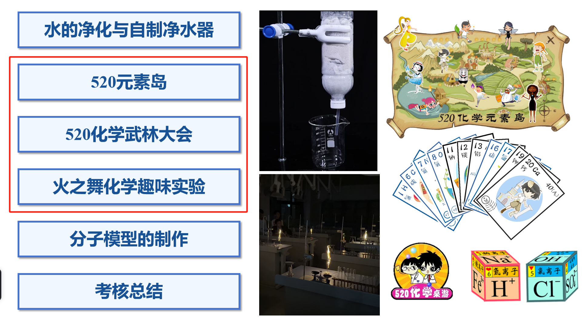 | 课程介绍 初中化学学习内容多,学习时间短,知识记忆的规律少,所以学生学习难免有较大的困难。游戏化教学是一种引导学生产生学习兴趣的课程类型,教师通过将化学知识和游戏化教学相结合,辅以恰当的游戏规则和方法,能让知识变得更加有趣生动。 钱扬义教授硕士研究生刘颖彤、林晓培、黄佳仪、郑加越受佛山市华英学校邀请,为初二年级20个班级的一千多名学生开展为期一个学期的游戏化学习的化学科普课程,共8个课时,钱扬义教授全程指导。此次科普课程包括“520化学元素岛”“520化学武林大会”“520火之舞”等系列课堂。通过游戏卡牌与趣味实验,学生了解了前20号元素的名称与书写、常见物质及其分类,知道了铁在氧气中燃烧、焰色反应的实验现象与生活应用,为学生未来的化学学习打下扎实基础。 本次课程以钱扬义教授工作室研发的最新版《玩转“520化学桌游”:化学用语启蒙教育游戏学习法》与化学趣味实验为设计基础,520化学桌游与实验的融合,不要求学生具有系统的化学知识,而是可以在玩中学、随时随地学化学知识,将化学用语与化学实验融合,让初二的学生在化学用语的学习过程中对化学学习产生兴趣,是趣味十足的化学科普课堂。