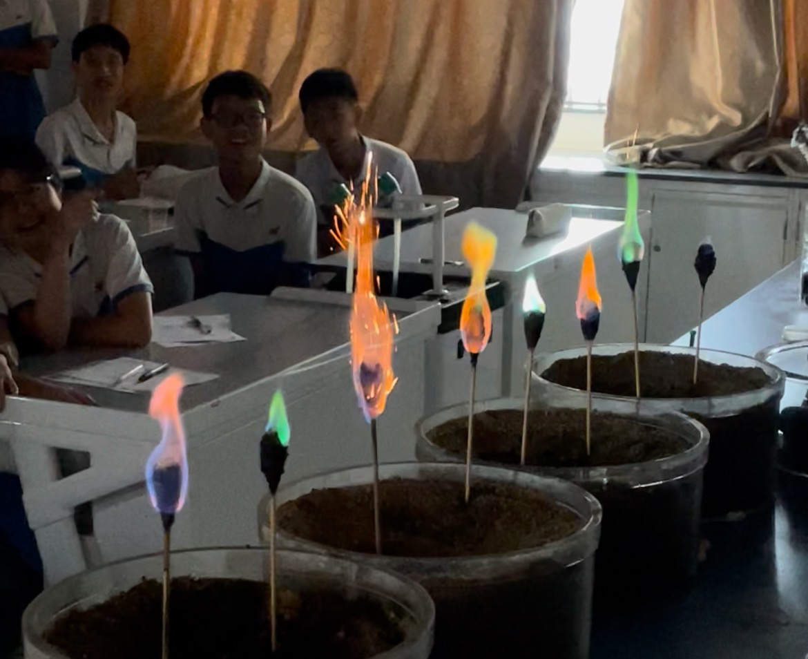 图8-11 “520化学武林大会”课堂剪影 Part.03 课程介绍·“520火之舞” 钱扬义教授的研究生们依托520化学趣味实验游戏开展了“520火之舞”课程。在上课的过程中,教师引导学生逐步认识铁在氧气中燃烧的现象及化学方程式,学生学到了如何书写与配平方程式,之后从生活中的烟花入手介绍焰色反应原理,让学生动手制作属于自己的“烟花棒”,学生们制作的烟花棒点燃后色彩绚烂、火星四射,激发他们对化学的好奇心与兴趣。