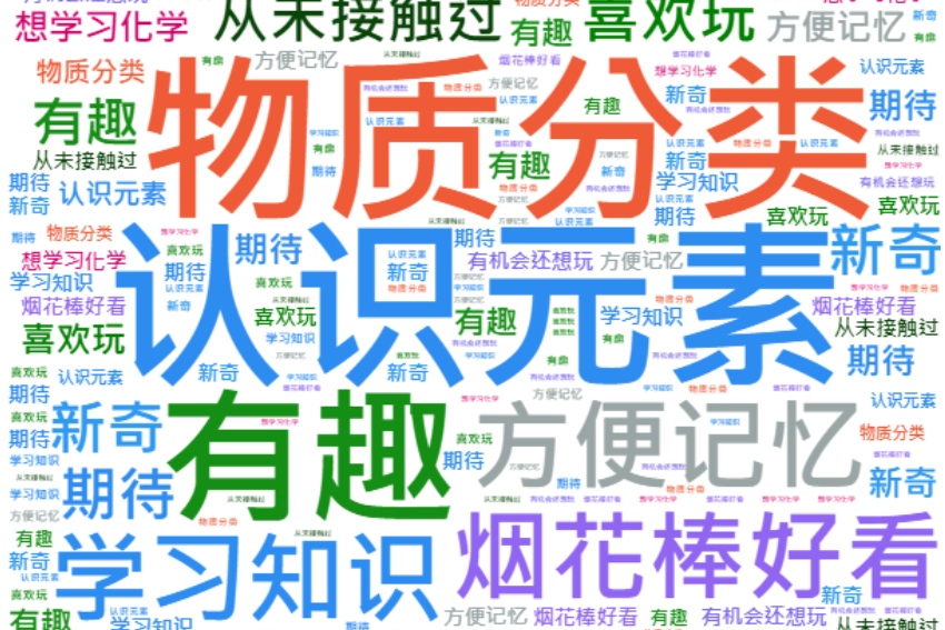 图12-16 “520火之舞”课堂剪影 Part.04 课程效果 在本次课程面向佛山华英学校初二年级20个班级,共一千多名学生,学生们均积极参与到520桌游系列课程中,这种寓教于乐的学习方式令他们耳目一新,表示他们在游戏中不仅享受了乐趣,还学习到丰富的化学知识,期待以后初三的化学课程。这种教学模式极大地激发了学生们对化学学科的热情。以下是学生对此次游戏课程的综合评价,通过词云图的形式直观展现。