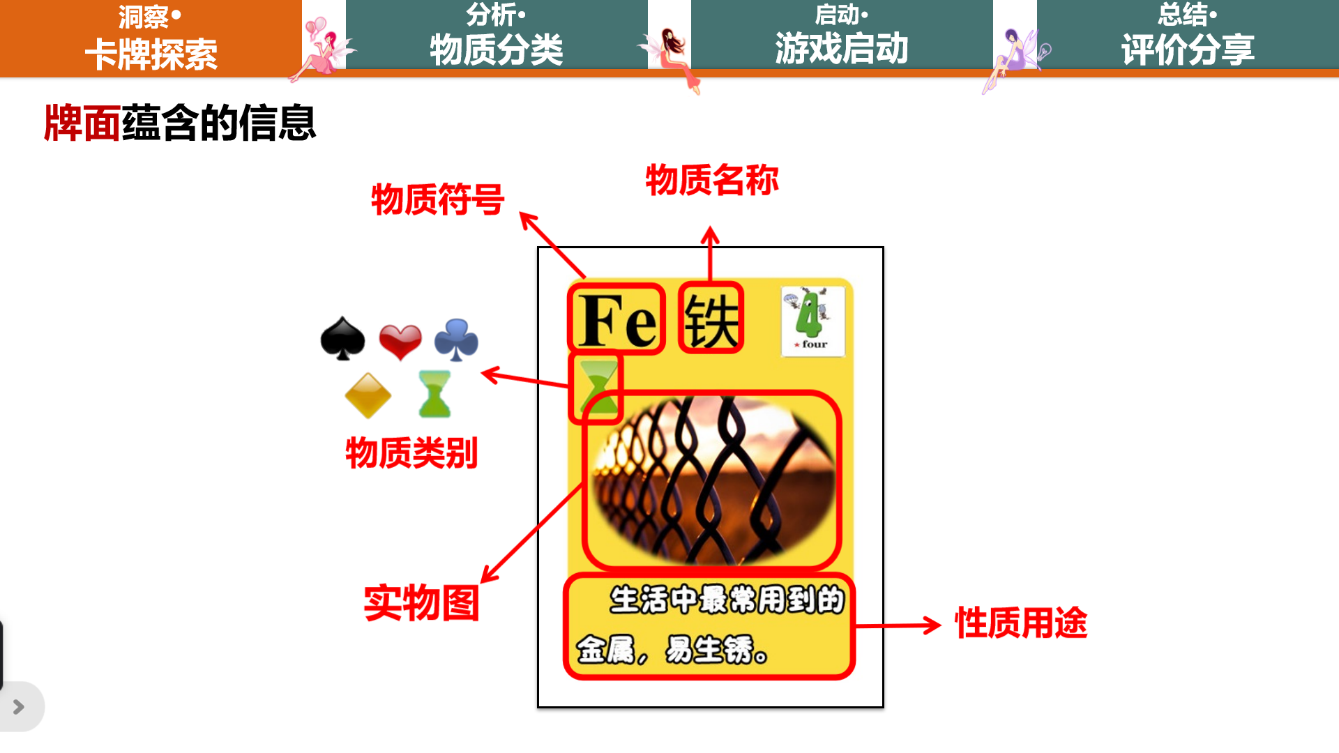 图3-7 ”520化学元素岛“课堂剪影 Part.02 课程介绍·520化学武林大会 为了让学生初步了解常见的物质名称、用途及其分类,钱扬义教授的研究生们依托520化学扑克牌中的物质卡牌开展了“520化学武林大会”课程。在上课的过程中,教师首先介绍了纯净物、混合物、单质、化合物、酸、碱、盐、氧化物等概念,之后带领学生探索并介绍物质牌的牌面信息,让学生学会将物质分类。学习知识后,教师带领同学们进行“520化学开胃菜”游戏,帮助他们更好地记忆与巩固所学的物质知识。