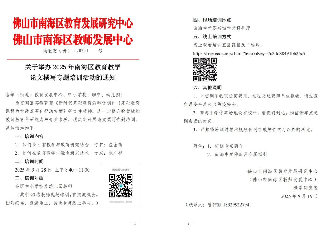 图1 南海区教育发展研究中心(教师发展中心)活动通知 “1+8”套餐教研理论与实践:破解全学段教学研究痛点 基于一节公开课开展8个微研究,形成文献综述、教学设计、讲课PPT、说课PPT、学案、教学论文、微课、五点量表等8个成果。符合一线教师思维、省时高效且适配各类课堂,能助力全学段全学科教师将日常教学材料转化为研究资源,破解 “备课耗时、成果碎片化” 难题。 温金菊《从日常教学到教育研究》专题培训 温金菊老师作为钱门弟子,长期深耕“1+8”套餐的实践,此次培训结合了钱扬义教授课题组的系列成果,从 “日常教学灵感挖掘” 到 “论文成果落地”,为教师们拆解可直接复用的操作路径: 01 备课预设成果 备课时即规划8类成果方向,如高中化学“自热包原理”课,同步设计文献综述、探究学案、素养测试题等,最终整合为论文。 02 紧扣课标教材 强调指导教师要重视教材课标,从课标提炼主题,如 “水的净化” 课, “能运用实验方法探究物质性质”,生成 “过滤操作微课”、“水质检测实验报告” 等成果。 03 论文撰写指导 讲解“4+1”写作模式,以教学设计、测评数据为基础,结合核心期刊案例,提炼创新点,避免论文空泛。
