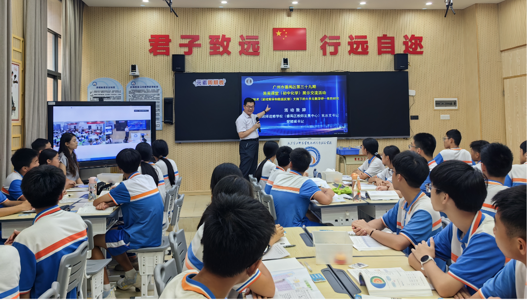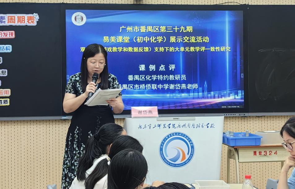 现转载相关推送,供大家交流学习。 游戏教学添动力,智慧课堂结硕果 ——记番禺区第三十九期易美课堂(初中化学)展示交流活动 2025年9月26日,由番禺区教师进修学校(番禺区教师发展中心)主办的番禺区第三十九期易美课堂(初中化学)展示交流活动分别在广东第二师范学院广州南站附属学校和番禺区南雅学校举办。活动聚焦“双技术(游戏教学和数据反馈)支持下的大单元教学评一致性研究”,结合双技术与“融・乐”智慧课堂的融合,探索初中化学抽象知识的教学难题,推动区域教育优质均衡发展。番禺区教师进修学校(番禺区教师发展中心)党总支书记、副校长黎耀威,化学教研员陈谦明,番禺区化学特约教研员、番禺区市桥侨联中学谢岱燕老师,广东第二师范学院广州南站附属学校潘文淦校长、黄春梅副主任,番禺区南雅学校王奕敏校长、汤婉芬副校长出席现场活动。番禺区北片、西片、南村、石楼及化龙片九年级化学教师参与现场教研,其余片区的九年级化学教师远程观摩,线上收看人数超820人。 开幕致辞:聚焦数字化转型,赋能化学教学 黎耀威书记强调,初中化学是培养学生科学素养的关键学科,抽象知识教学一直是难点。本期易美课堂紧扣“双技术融合”,直面教学痛点,为教师提供实践交流平台,助力教学能力提升,进一步推动番禺化学教育质量整体进阶。