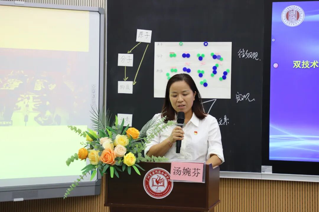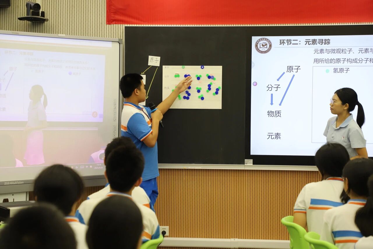 图1 黎耀威书记致辞 课例展示:游戏激趣+数据赋能,重构化学课堂 番禺区南雅学校陈颖瑜老师展示课例《元素》。她通过自制原子模型和“520化学卡牌”引导学生自主命题、互评互考,实现从“解题者”到“出题人”的角色转变。结合“智慧学习卡”实时收集学情数据,精准突破符号含义等重难点,课堂生动而高效。
