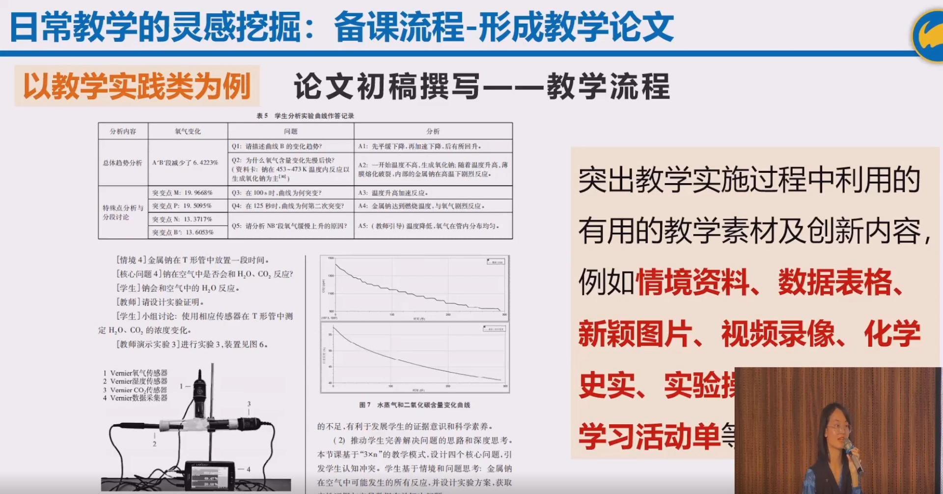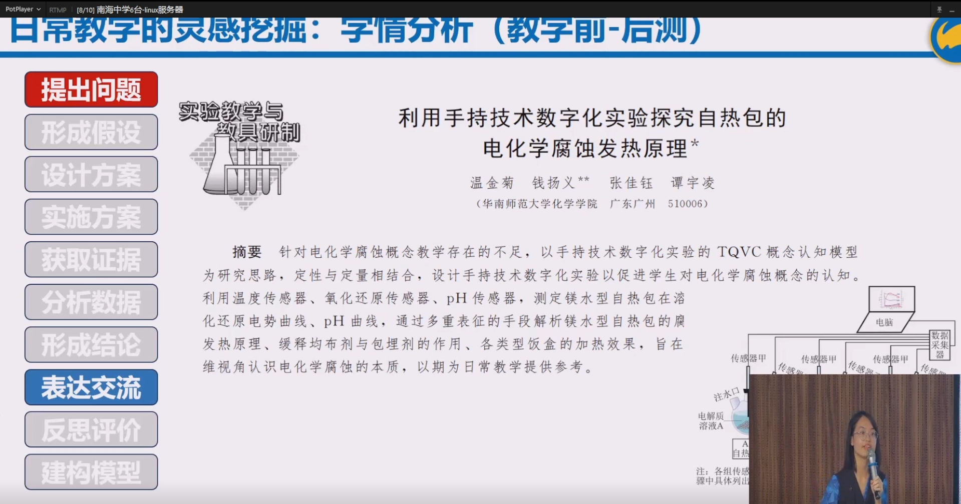 图2 温金菊老师进行培训活动 在此次活动中,温金菊老师还结合钱扬义教授课题组成果,重点介绍了手持技术数字化实验与游戏化教学两大创新教学手段: 01 手持技术数字化实验-提供实证支撑 手持技术通过温度、pH、氧化还原电势等传感器,将化学实验中的微观变化转化为实时数据曲线,既能突破传统实验的观察局限,更能为 “1+8” 套餐中的教学设计、论文撰写提供精准实证依据。